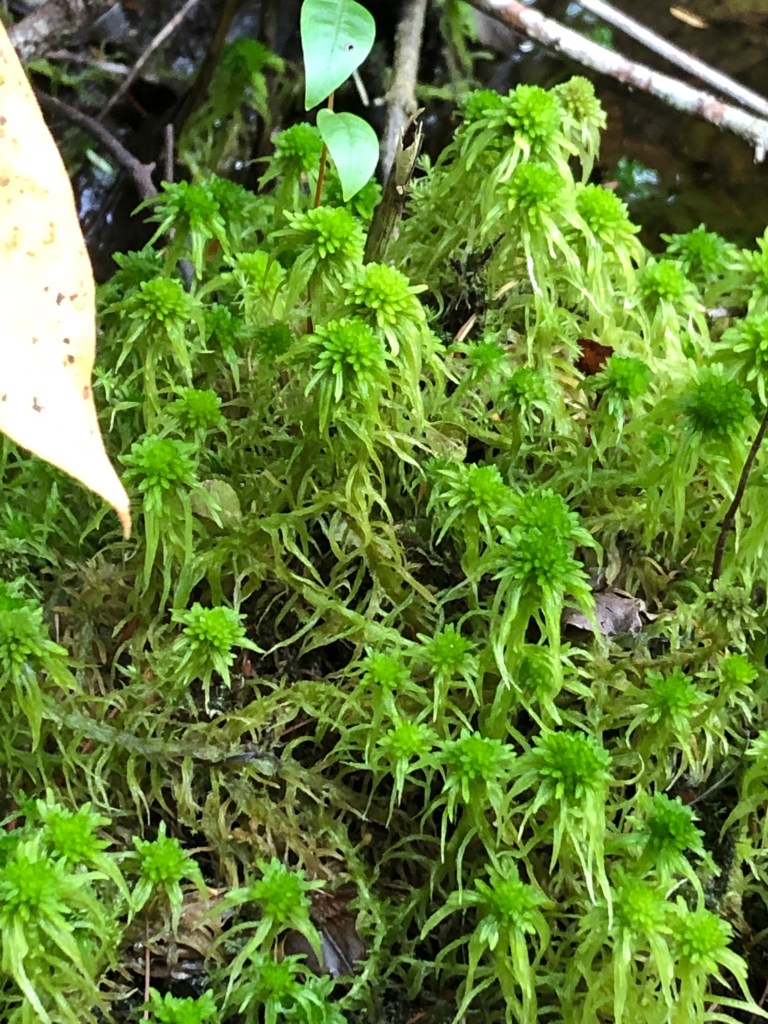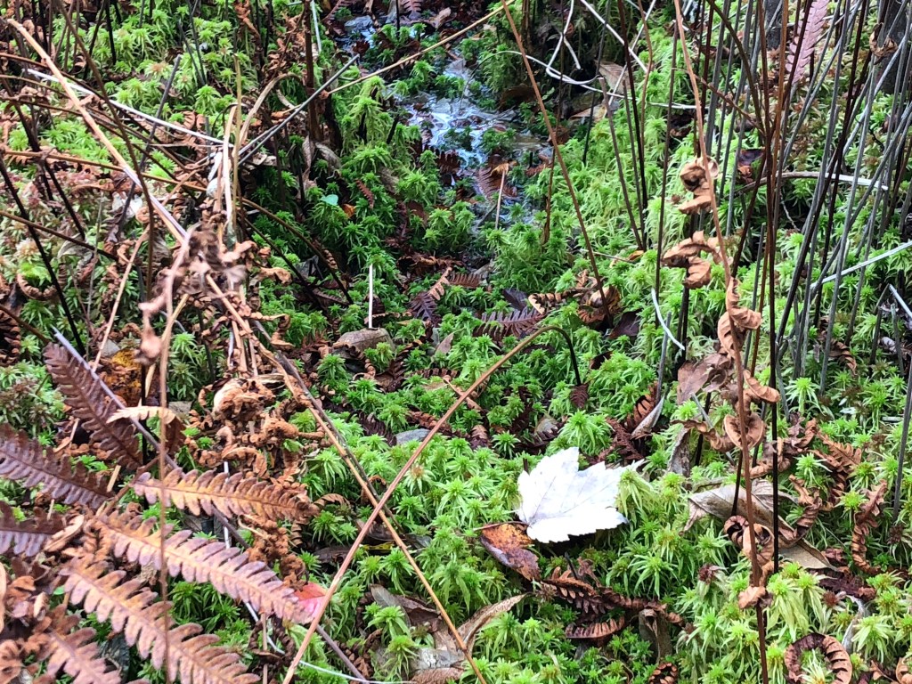 At the end of the boardwalk, the trees give way to tall aquatic grass, and the squelching peat allows those brave enough to continue a little further toward the pond proper. More green Sphagnum sits in the shade of the tall grass, submerged or stretching their capitula just above the water’s surface. In full view of the sun, however, a dense and extensive carpet of deep wine red Sphagnum grows with large star-like capitula that seem to mirror the sun they fearlessly worship despite the powerful UV rays. Tiny sundews emerge from this sun-drenched carpet, glistening with sticky droplets for snaring insects. Carnivorous pitcher plants, sundews and the infamous Venus fly trap are all bog specialists, requiring the high humidity and acidity of Sphagnum mats to grow. They have evolved their carnivorous lifestyles because the bog is low in nutrients like nitrogen which Sphagnum purposefully keeps in low supply to prevent other plants from colonizing the area.