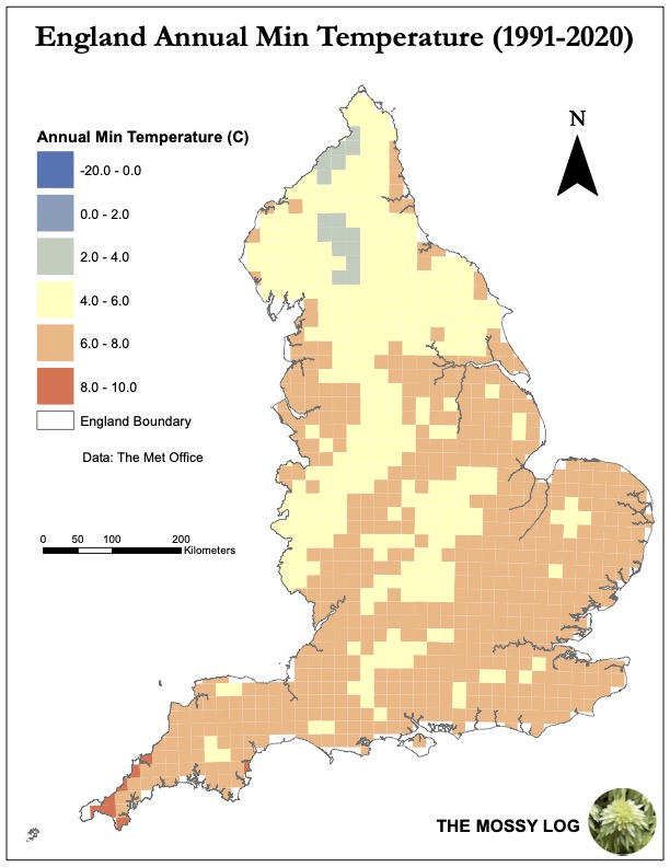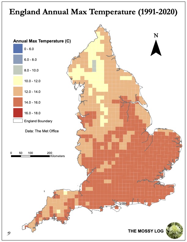 The north of England has the lowest maximum and minimum temperatures in the country, primarily due to the region having the highest altitude, with all of the highest peaks in the country being in this region.